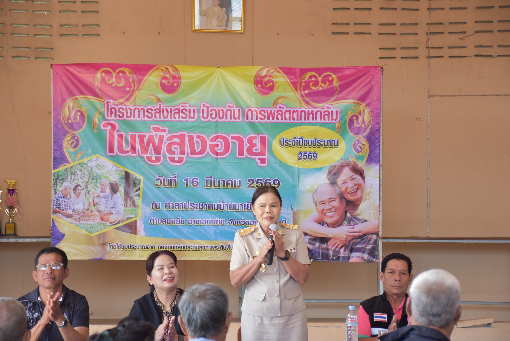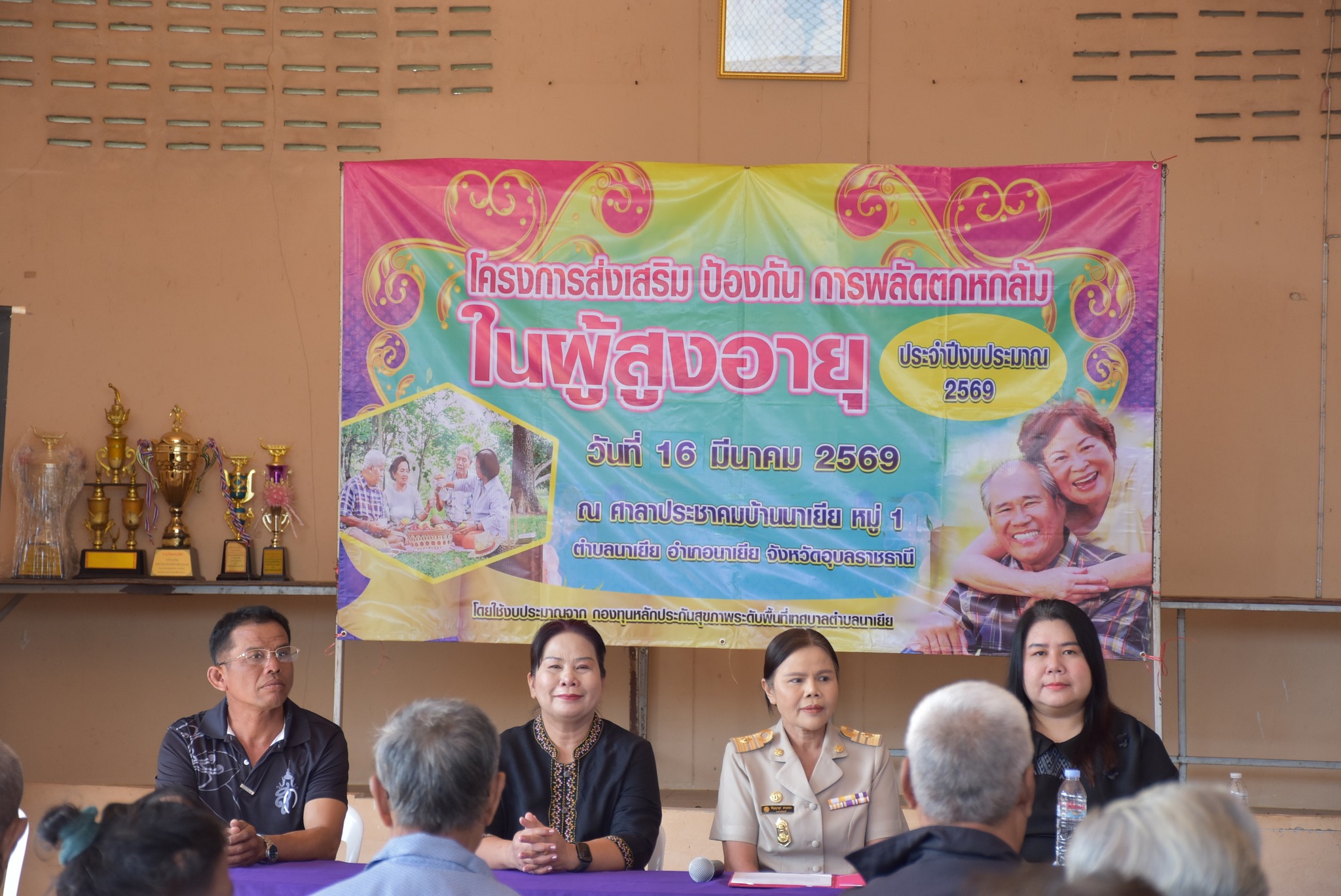 วันจันทร์, 16 มีนาคม 2569 16:17วันที่ 16 มีนาคม 2569 เวลา 09.00 น. นางสาวชัญญานุช สายทอง นายกเทศมนตรีตำบลนาเยีย ประธานเปิดโครงการฯ พร้อมด้วย นางสำเนียง ทีฆะกุล รองนายกเทศมนตรี นายสนทยา สายบุญสา รองประธานสภาเทศบาล นางสาวณภาดา บุญยืน หัวหน้าฝ่ายอำนวยการ นางสาวนวลประกาย สุนนท์ชัย นักวิชาการสาธารณสุขชำนาญการ นางสาวณัฐธิดา อุ่นใจ นักพัฒนาชุมชนชำนาญการ นางสาวศศิกร นีระมนต์ นักประชาสัมพันธ์ปฏิบัติการ นางเตือนใจ ดอกพุฒ ประธาน อสม. หมู่ที่ 1 นางวันนี พวงใย กรรมการกองทุนหลักประกันสุขภาพ ทต.นาเยีย นางวีรวรรณ ห่องคำ กรรมการกองทุนหลักประกันสุขภาพ ทต.นาเยีย พร้อมด้วย อสม.หมู่ 1 และเจ้าหน้าที่เทศบาล ได้ร่วม พิธีเปิดโครงการส่งเสริมและป้องกันการพลัดตกหกล้มในผู้สูงอายุ เพื่อเสริมสร้างความรู้ในการดูแลสุขภาพ การป้องกันอุบัติเหตุจากการหกล้ม และส่งเสริมคุณภาพชีวิตที่ดีให้แก่ผู้สูงอายุในชุมชน ณ ศาลาประชาคม หมู่ที่ 1 ตำบลนาเยีย อำเภอนาเยีย จังหวัดอุบลราชธานี
