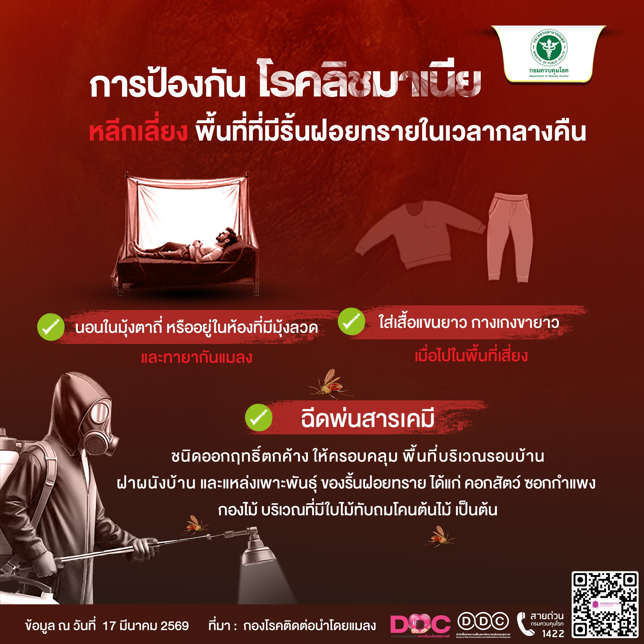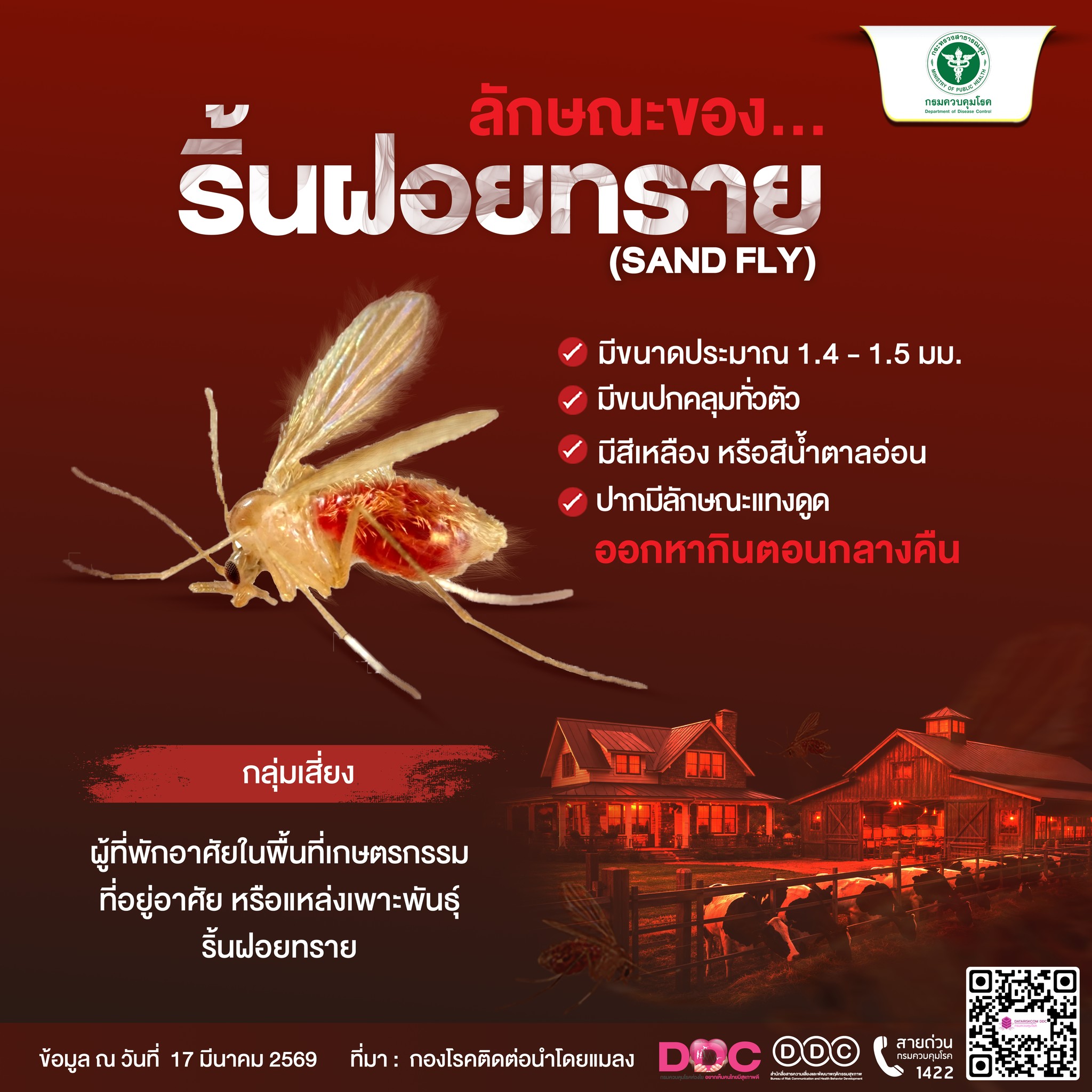 วันอังคาร, 17 มีนาคม 2569 14:51ระวัง! "โรคลิชมาเนีย" ภัยร้ายจากริ้นฝอยทราย ทำความรู้จักกับโรคติดต่อที่มากับแมลงตัวจิ๋วแต่พิษสงร้ายกาจ พร้อมวิธีป้องกันตัวเองให้ปลอดภัย โรคลิชมาเนีย คืออะไร? เกิดจากเชื้อโปรโตซัวที่แพร่กระจายผ่าน "ริ้นฝอยทรายเพศเมีย" ที่มีเชื้อ แหล่งเพาะพันธุ์และสัตว์รังโรค ริ้นฝอยทรายมักพบในพื้นที่ ค่อนข้างชื้นและมีสารอินทรีย์สูง เช่น: คอกสัตว์ กองขยะ โพรงไม้ หรือโพรงดิน สัตว์รังโรค: หนู, สุนัข, แมว, วัว, ควาย รวมถึงสัตว์ป่า อาการที่ควรสังเกต หากโดนกัดและมีอาการดังต่อไปนี้ ควรรีบพบแพทย์: มีตุ่มนูนพองใสและแดง แผลมีขอบชัด อาจเป็นแผลเปียกหรือแผลแห้ง อาการทางร่างกายอื่น ๆ: ตัวซีด, ตับโต, ม้ามโต วิธีการป้องกัน - สวมเสื้อผ้าให้มิดชิด เพื่อป้องกันริ้นกัด - นอนในมุ้งชุบสารเคมี - หลีกเลี่ยงการอยู่นอกบ้าน ในช่วงพลบค่ำ ซึ่งเป็นเวลาที่ริ้นฝอยทรายออกหากิน - หากสงสัยว่ามีอาการ ให้รีบไปตรวจร่างกายที่โรงพยาบาลทันที "พัฒนาคน พัฒนางาน สร้างชุมชนมีส่วนร่วม สู่ชุมชนเข้มแข็ง " ภาพ : ศูนย์บริการทางการแพทย์และสาธารณสุขฯ ข่าว : งานประชาสัมพันธ์ สำนักปลัด 045 306112 045 429462 งานป้องกันฯ #ผู้นำหญิง #นายกหนิง #นาเยียอบอุ่น #เทศบาลตำบลนาเยีย