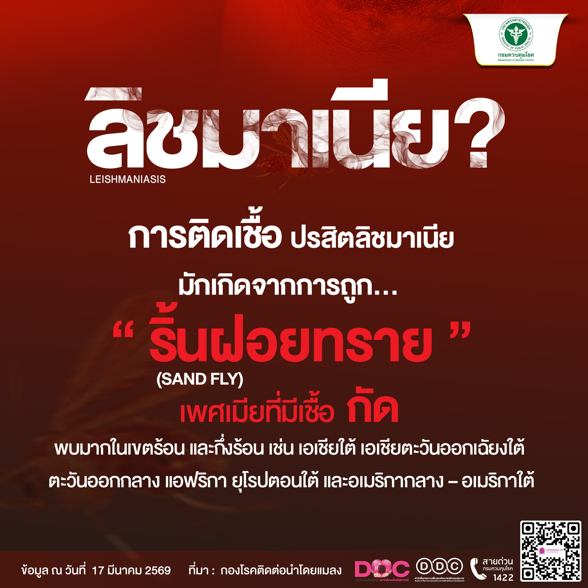 วันอังคาร, 17 มีนาคม 2569 14:51ระวัง! "โรคลิชมาเนีย" ภัยร้ายจากริ้นฝอยทราย ทำความรู้จักกับโรคติดต่อที่มากับแมลงตัวจิ๋วแต่พิษสงร้ายกาจ พร้อมวิธีป้องกันตัวเองให้ปลอดภัย โรคลิชมาเนีย คืออะไร? เกิดจากเชื้อโปรโตซัวที่แพร่กระจายผ่าน "ริ้นฝอยทรายเพศเมีย" ที่มีเชื้อ แหล่งเพาะพันธุ์และสัตว์รังโรค ริ้นฝอยทรายมักพบในพื้นที่ ค่อนข้างชื้นและมีสารอินทรีย์สูง เช่น: คอกสัตว์ กองขยะ โพรงไม้ หรือโพรงดิน สัตว์รังโรค: หนู, สุนัข, แมว, วัว, ควาย รวมถึงสัตว์ป่า อาการที่ควรสังเกต หากโดนกัดและมีอาการดังต่อไปนี้ ควรรีบพบแพทย์: มีตุ่มนูนพองใสและแดง แผลมีขอบชัด อาจเป็นแผลเปียกหรือแผลแห้ง อาการทางร่างกายอื่น ๆ: ตัวซีด, ตับโต, ม้ามโต วิธีการป้องกัน - สวมเสื้อผ้าให้มิดชิด เพื่อป้องกันริ้นกัด - นอนในมุ้งชุบสารเคมี - หลีกเลี่ยงการอยู่นอกบ้าน ในช่วงพลบค่ำ ซึ่งเป็นเวลาที่ริ้นฝอยทรายออกหากิน - หากสงสัยว่ามีอาการ ให้รีบไปตรวจร่างกายที่โรงพยาบาลทันที "พัฒนาคน พัฒนางาน สร้างชุมชนมีส่วนร่วม สู่ชุมชนเข้มแข็ง " ภาพ : ศูนย์บริการทางการแพทย์และสาธารณสุขฯ ข่าว : งานประชาสัมพันธ์ สำนักปลัด 045 306112 045 429462 งานป้องกันฯ #ผู้นำหญิง #นายกหนิง #นาเยียอบอุ่น #เทศบาลตำบลนาเยีย